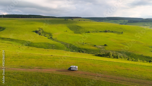 Drone flight over a motorhome in the Caucasus Mountains at sunset