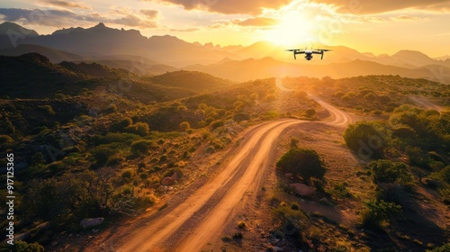 drone, road, mountain, landscape, sunset, sky, aerial, flight, photo, horizon, gold, light, dust, path, hill, trail, adventure, travel, nature, exploration, wanderlust, discovery, remote, wild, outdoors, freedom, vista, view, panorama, countryside, rural, scenery, desert, arid, rocky, sun, beam, ray, warm, colours