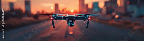 Drone photography of urban architecture, closeup on the drone against a backdrop of skyscrapers, capturing innovation