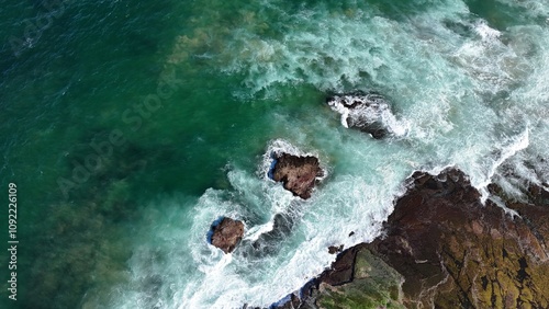 Drone shot aerial view of waves crashing onto rocks near a beach in Australia in summer