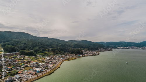Drone shot of Lake Suwa & Kiso Mountains. Nagano Japan