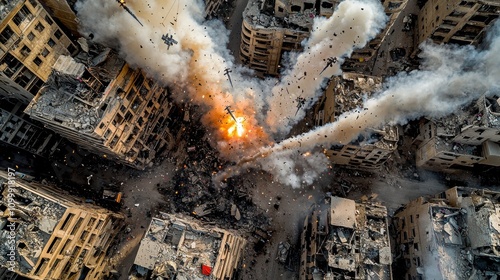 Drone view of an urban battlefield high-conflict zone aerial photography smoke trails action scene destruction