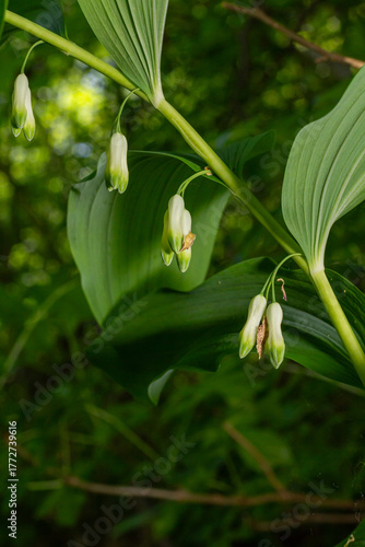 Drooping white flowers of Polygonatum multiflorum bloom gracefully in a lush woodland setting during early spring sunlight