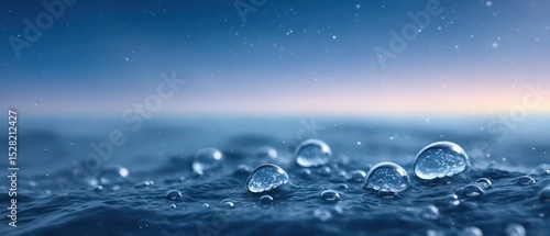 Droplets of water glistening on the surface of a tranquil lake against a serene gradient sky reflecting calming hues of blue and soft violet capturing a peaceful natural setting