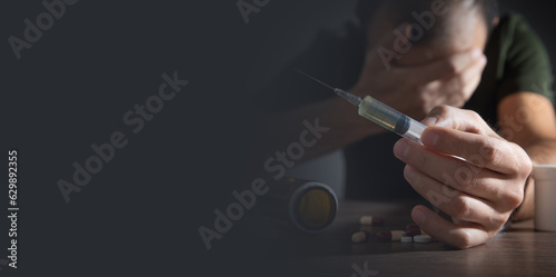 Drug addict man with a syringe and drugs. Addiction