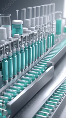 Drug manufacturing process. Conveyor with medical ampoules line at a modern pharmaceutical plant. Pharmacology production, medicine industry from laboratory 2 factory, pharmacy. Healthcare, pharma 3D