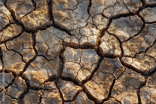 Dry ground environment with dirt in drought. Textured earth arid in nature desert land. Mud clay surface background in soil. Climate hot dryness rough brown heat pattern crack.