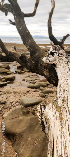 Dry log of the fallen tree on the rock beach on a cloudy day.