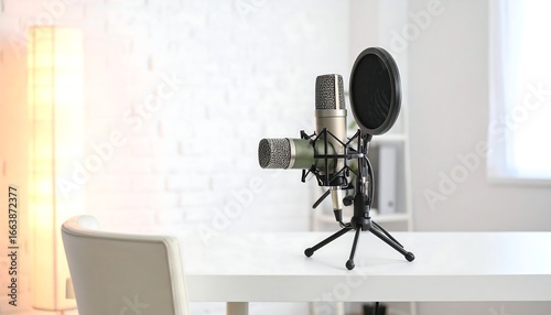 microphone, microphone, condenser, racked, tripod, desk, table, chair, studio, room, office, equipment, gear, audio, sound, recording, broadcasting, streaming, interview, communication, production, content, creation, media, journalism, radio, music, indoor, interior, bright, clean, white, minimalist, modern, professional, contemporary, workspace, background, blurred, bokeh, window, light, lamp, technology