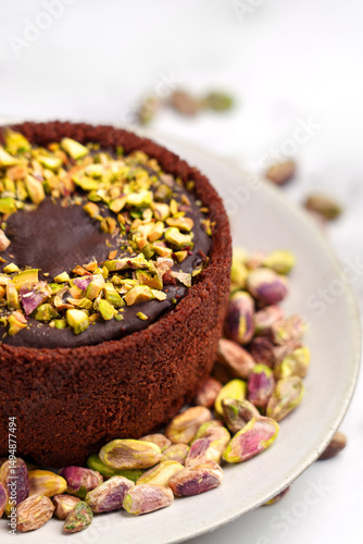 Dubai chocolate cheesecake with scattered pistachio nuts on ceramic plate close up