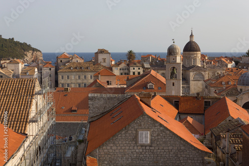 dubrovnik, dalmatia, croatia, sunset, city landscape, sea, dubrovnik, city, unesco, mediaeval, europa, roof, aerial, top, view, town, famous, adriatic, city landscape, cathedral, church, dome, rooftop, croat, architecture, heritage, nobody, landscape, summer, walled, day, scenic, panorama, historical building, ancient, historic, wall, stone, travel, rock, balkans