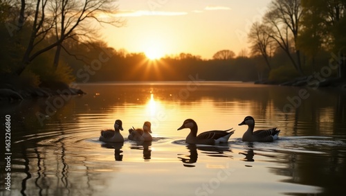 Ducks glide on a calm lake at sunrise.