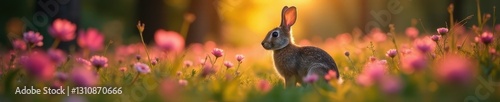 horizontal, wide, outdoors, wildflower, landscape, spring, summer, rabbit, mammal, image, lagomorph, underbrush, pink flower, animal, ecosystem, wild, photo, ear, hare, dusk, wildlife, twilight, countryside, rural, natural, alert, flora, wood, vertical, forest, closeup, fauna, environment, nature
