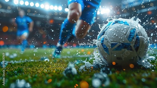 dynamic active pose of football or soccer player running fast and kicking a ball while training at dramatic stadium shot