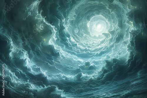 Dynamic cosmic vortex with swirling light and vibrant teal hues, capturing powerful universal energy in deep space abstract composition.