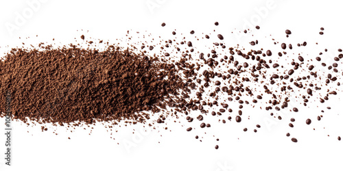 Dynamic display of coffee powder descending onto a pristine white background, emphasizing captivating detail.