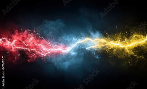 energy, force, contrast, dynamic, lightning, power, red, blue, yellow, light, electricity, plasma, powerline, stripes, glowing, effect, abstract, digital, illustration, design, art, motion, speed, powerful, high-coloured, colours, background, texture, blur, visual, graphic, line, striation, creative