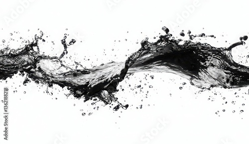 Dynamic splash of black water frozen in motion against a white background, showcasing fluidity and energy. Isolate on white background, Copy space, commercial use