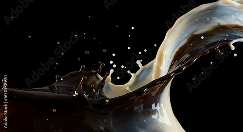 Dynamic splash of rich, dark liquid mixing with creamy white liquid, creating an energetic collision of colors and textures against a stark black background