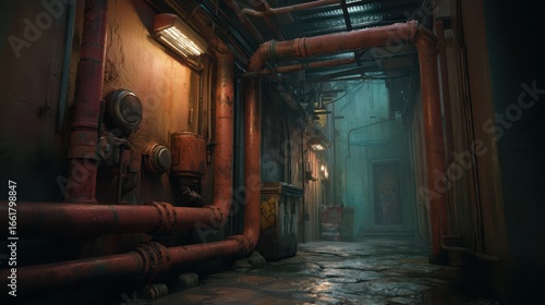 Dystopian Alley with Rusted Pipes and Dim Lighting in Urban Setting