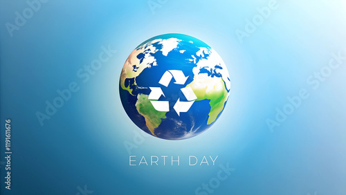 Earth Day concept with globe featuring recycling symbols and blue background for environmental awareness
