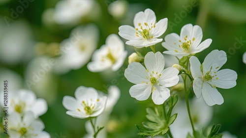 Earth day environmental concept. Delicate white flowers bloom amidst lush green foliage in a serene natural setting.