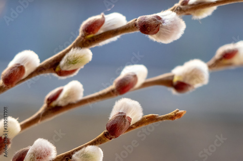 Easter background, willow branches with catkins on a blue blurred background