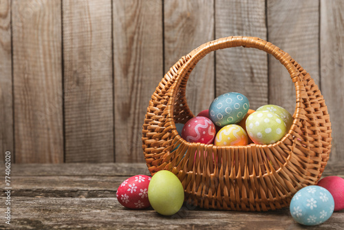 Easter basket filled with colorful eggs and a bouquet of tulips on a textured wooden table. Easter celebration concept. Colorful easter handmade decorated Easter eggs. Place for text. Copy space