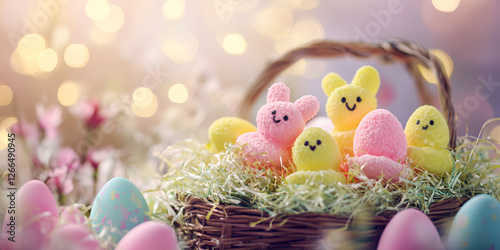 Easter Basket with Colorful Marshmallow Chicks and Decorated Eggs