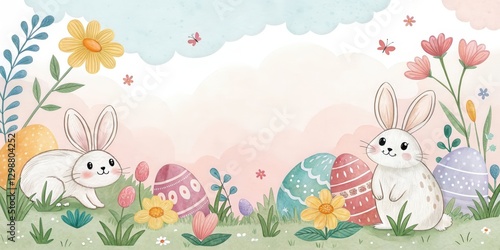 Easter bunnies and colorful eggs amidst flowers and plants. A charming illustration that captures the spirit of the holiday