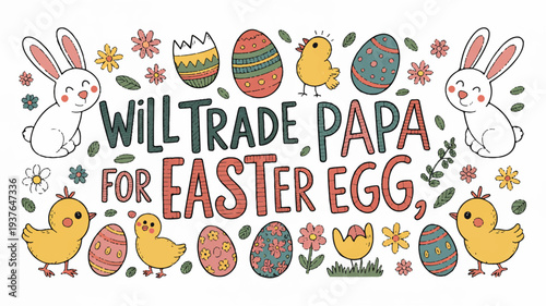 Easter eggs and bunnies with chicks colorful floral pattern 'will trade papa for easter egg' text