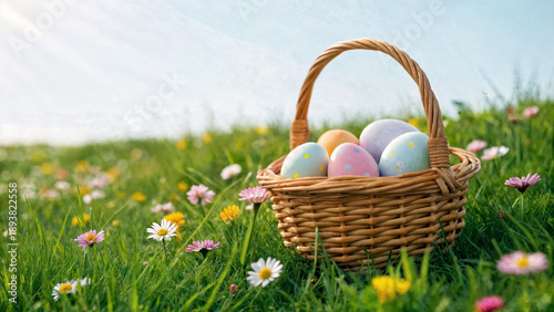 nature, holiday, easter, spring, egg, flower, meadow, easter egg, basket, egg, decoration, celebration, colourful, isolated, food, grass, colours, wicker, blue, pink, gift, season, yellow, green, symbol, traditional, tradition