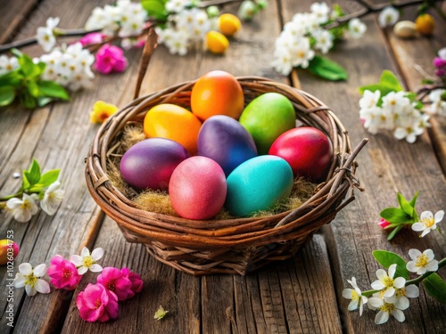 Easter eggs in vibrant colors rest within a charming rustic basket, set against a weathered wooden table adorned with fresh spring blooms for a delightful scene.