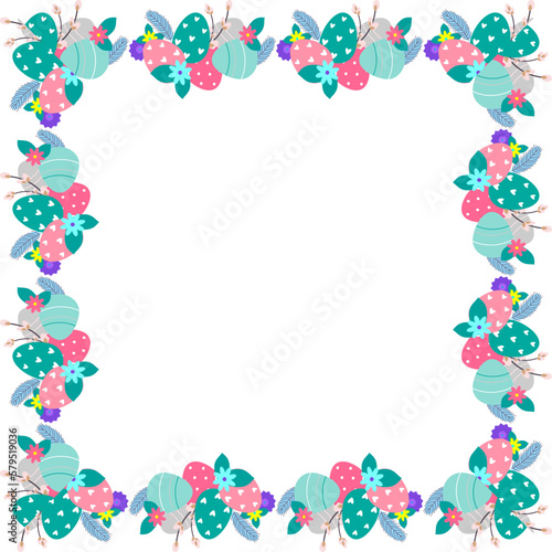 Easter flower wreath . Easter frame with decorated eggs and flowers and symbols of bright Easter