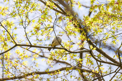 さえずる可愛いセンダイムシクイ(ムシクイ科) 英名学名:Eastern Crowned Warbler (Phylloscopus coronatus, family comprising Warbler) 新緑が美しい。 神奈川県清川村、早戸川林道-2025年