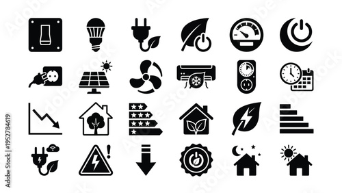 energy, icon, set, solar panel, light bulb, leaf, renewable energy, sustainability, green, environment, ecology, conservation, energy saving, power, electricity, sustainable, black-and-white, isolated, white background, eco, energy efficiency, solar, wind, battery, clock, graph, house, lightning, gear, warning, plug, mains outlet, sun, moon, phase, thermometer, recycling, symbol, logotype, pictogram, simple, minimalistic, illustration, graphic, vector, clip art