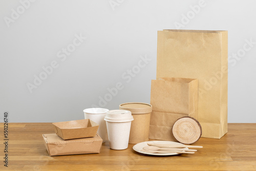 Eco friendly food packaging. Paper recycling zero waste natural products. A box of paper for food disposable catering of nature and recycling concept. Plastic free set on background.