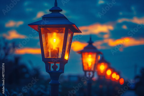 Eco friendly lanterns powered by solar energy illuminate road in park in evening with cozy warm light. Concept of sustainable eco energy, alternative energy sources, with copy space