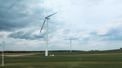 electricity, wind, turbine, energy, renewable, green, clean, power, landscape, rural, environment, field, countryside, sky, cloudy, windmill, sustainable, modern, infrastructure, tall, blade, generator, aerial, motion, white, eco, height, farm, electric, weather, overcast, air, technology, fuel, future, environmental, station, rotation, powerline, farmland
