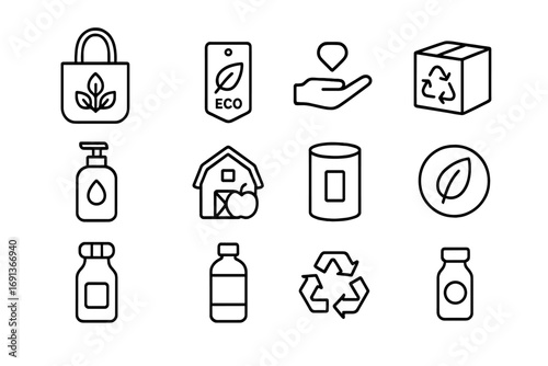 eco, shopping, icon, outline, icon, set, conscious, recyclable, bag, label, fair, trade, product, recycled, cardboard box, container, local, produce, minimal, organic