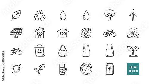 Eco-Friendly Icon Set: A comprehensive collection of hand-drawn outline icons, symbolizing eco-friendly practices and sustainability. Each icon, from leaves to recycling symbols.
