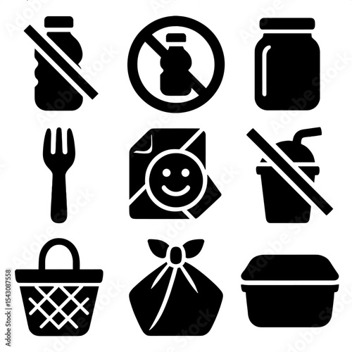 eco, friendly, icon, set, solid, style, icon, anti, plastic, alternative, crossed, out, bottle, free, zone, glasses, jar, alternative, bamboo, utensil, paper, enclosed, with, smile, straw, symbol, basket