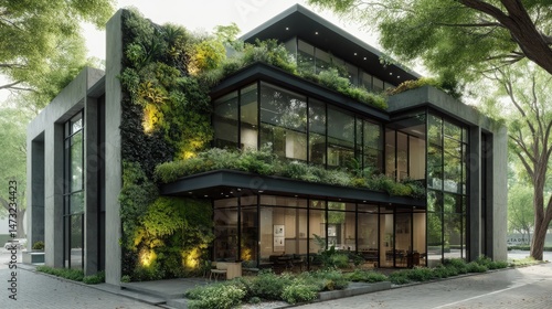 Eco-Friendly Office Oasis: An architectural marvel seamlessly integrates nature with sleek design, featuring a vertical garden and expansive windows.
