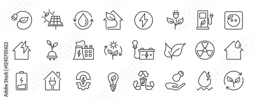 Ecology line icon set. Eco, Ecofriendly, Solar panel, Bio, Power, Electricity, Organic. Vector