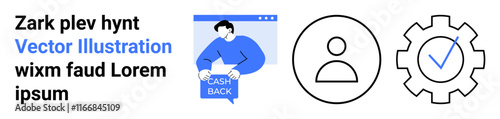 E-commerce cashback concept with a person receiving cash back, user profile, and settings gear icon. Ideal for financial services, user accounts, settings management, website design, app interfaces