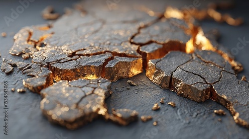 Economic uncertainty analysis in wealth and crisis concept. Textured surface with cracks revealing golden layers beneath.