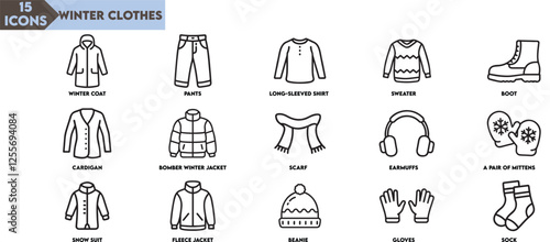 Editable Line Art Winter Clothing Icons: Jackets, Hats, Scarves, Gloves, Shoes, Pants, Socks, Sweaters, and Fleece Jackets. Vector Illustration on White Background.
