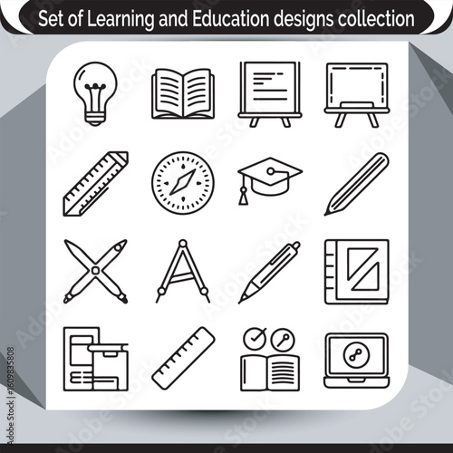 education, learning, icon, set, bulb, book, compass, ruler, crayons, pen, protractor, divider, notebook, laptop, clock, blackboard, mortarboard, school, supply, study, cognition, teaching, student, teacher, drawing, mathematic, science, literature, design, outline, vector, graphic, symbol, illustration, collection, equipment, stationary, technology, presentation, progress, creativity, tool, instrument, skill, cv