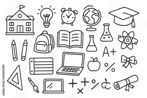 education, school, icon, set, line, outline, learning, study, academic, simple, teaching, classroom, symbol, minimal, student, supply, tool, children, cognition, book, crayons, diploma, laptop, globe, bulb