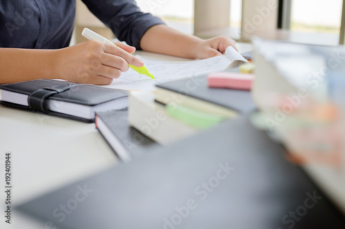 Education concept. Students studying and brainstorming campus concept. Close up of students discussing their subject on books textbooks and writing to notebook. Selective focus.